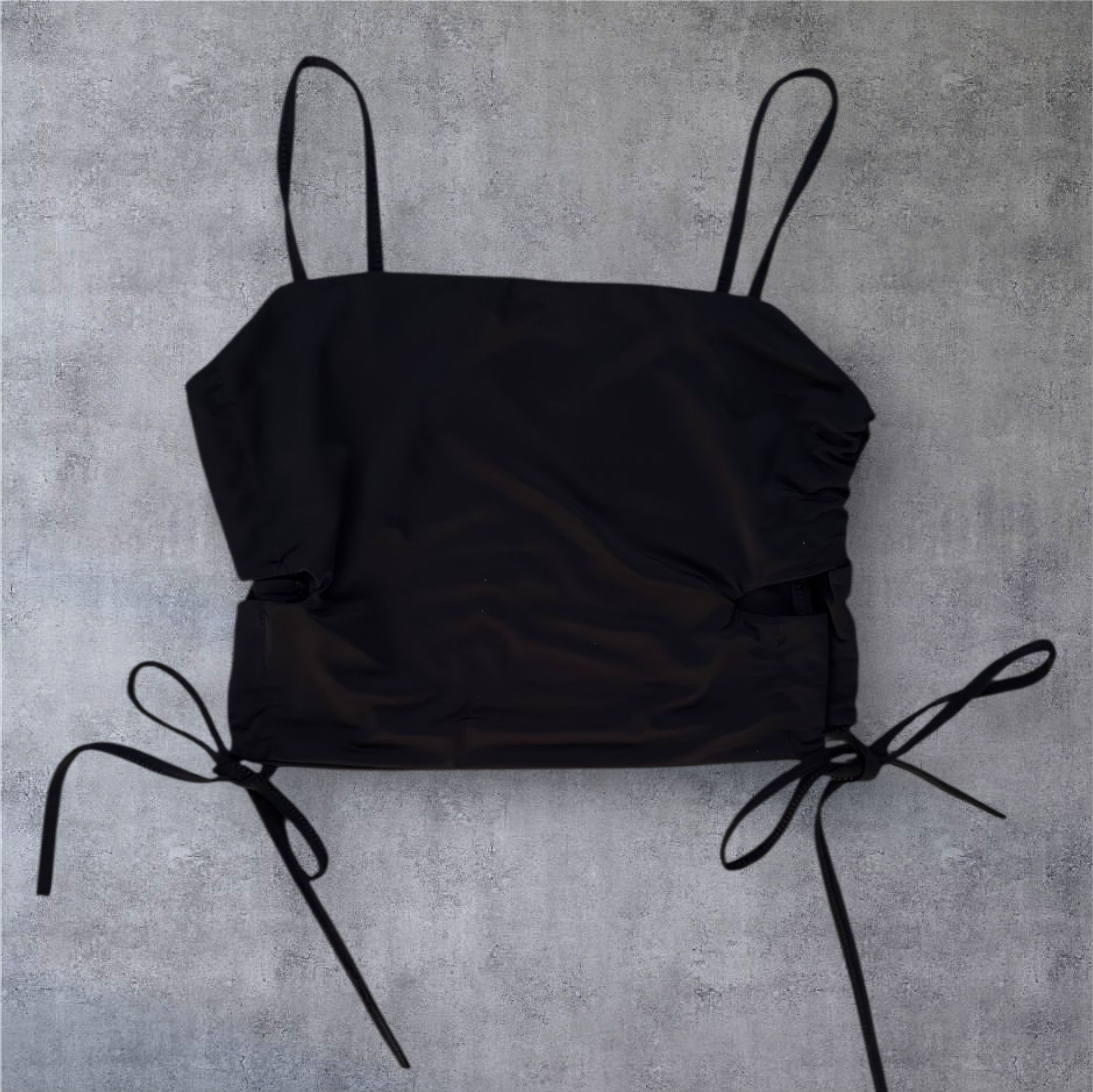lycra, tiene tiras para atar a los costados.